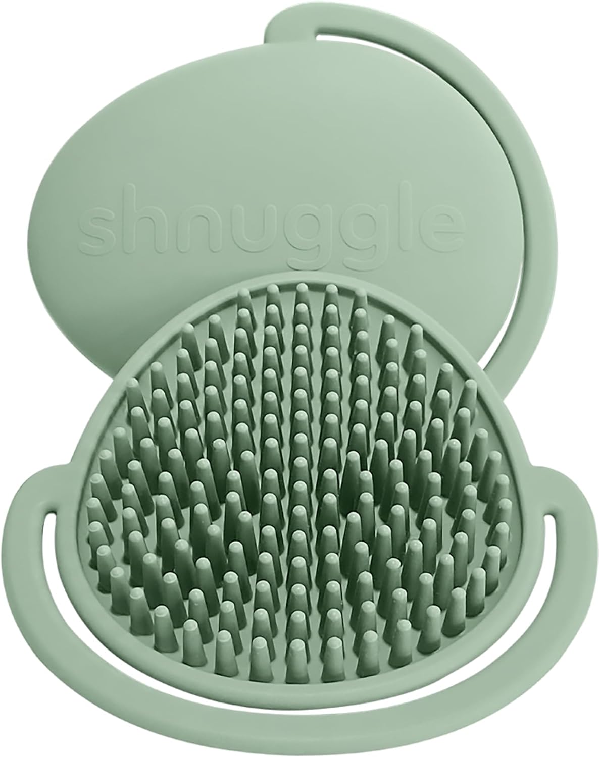 The Shnuggle Baby Bath Brush gently massages baby’s head to brush away cradle cap, cleanse, and shampoo. Designed to fit comfortably in the palm of your hand, the super soft feel of the brush against baby’s skin helps to calm and soothe at bath time.