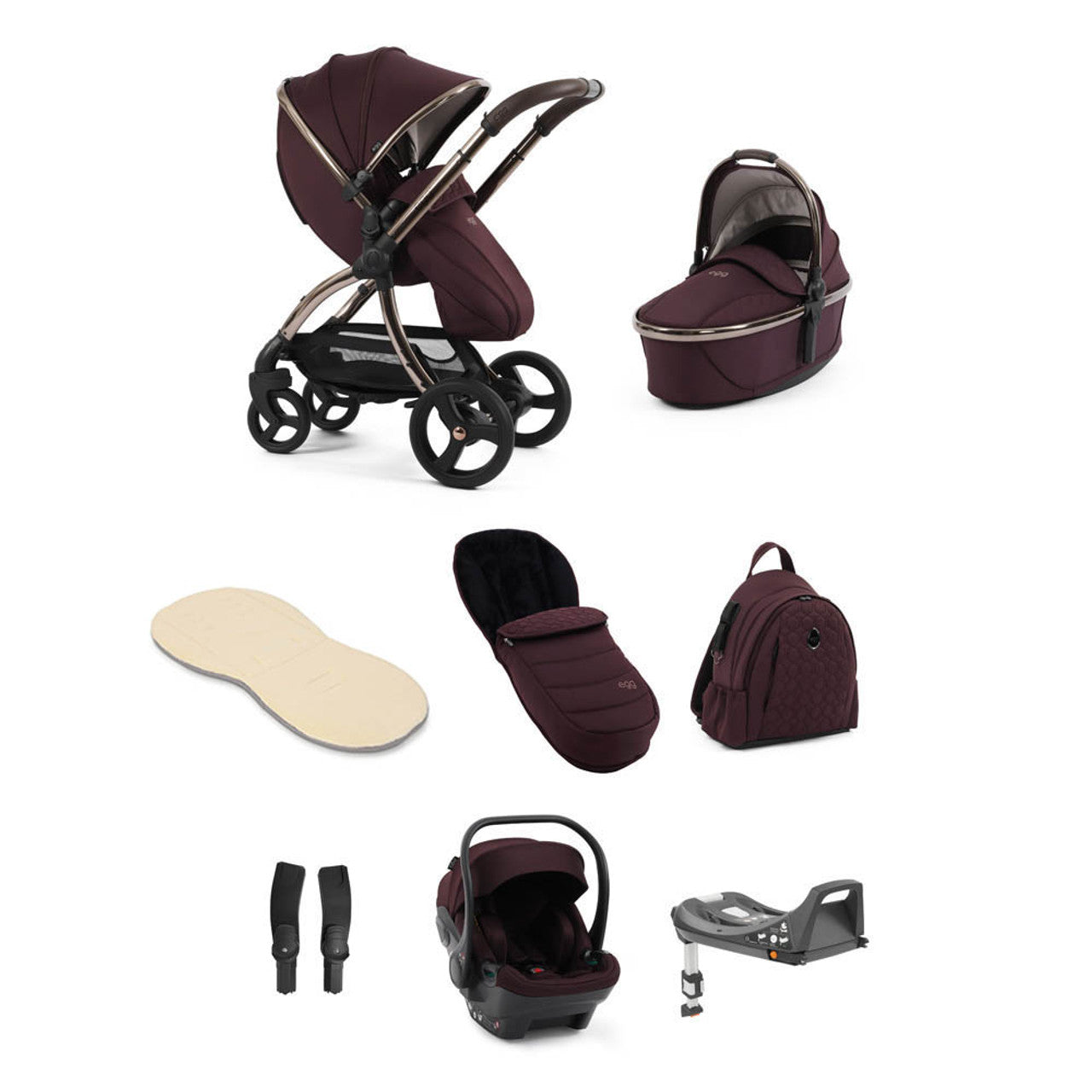 All egg3® colourways are available to purchase an 8-piece luxury package, including: egg3® stroller, carrycot, fur seat liner, footmuff, backpack, egg® Shell infant car seat, ISOFIX base, multi car seat adaptors.